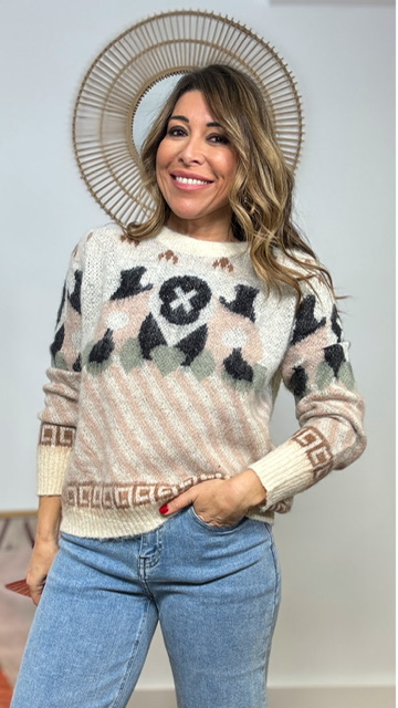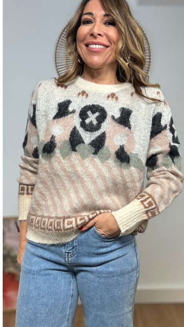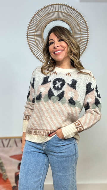 Jersey estampado con fondo en color beige. Talla única válida para tallas desde la 36 hasta la 42/44.