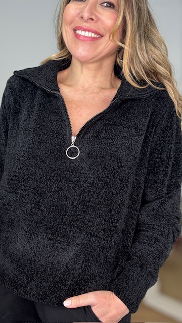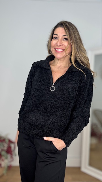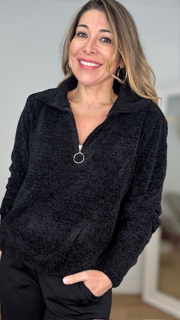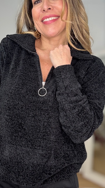Jersey de chenilla estilo polo en color negro. Talla única válida desde la 36 hasta la 44.