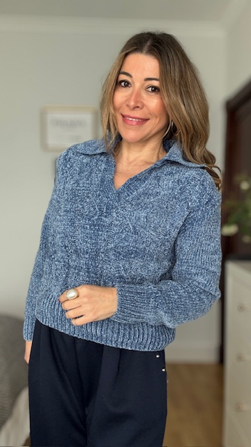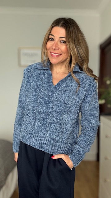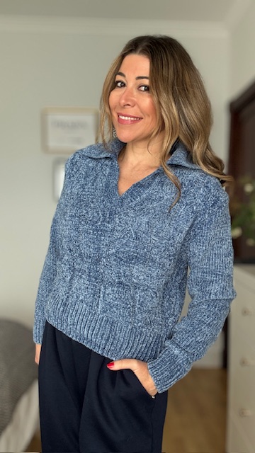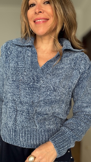 Jersey de chenilla trenzado en color azul. Talla única válida desde la 36 hasta la 44.