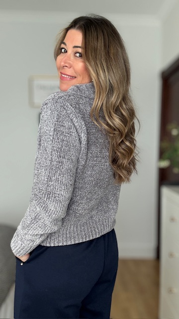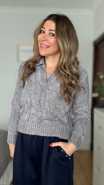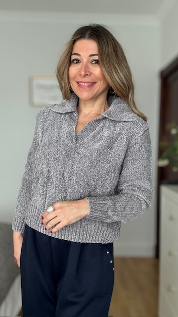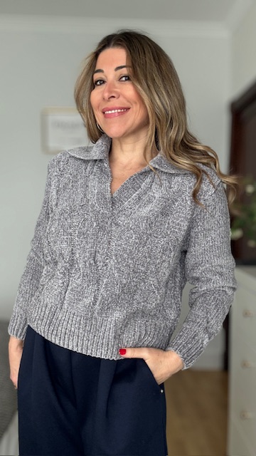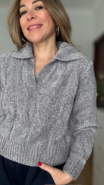 Jersey de chenilla trenzado en color gris. Talla única válida desde la 36 hasta la 44.