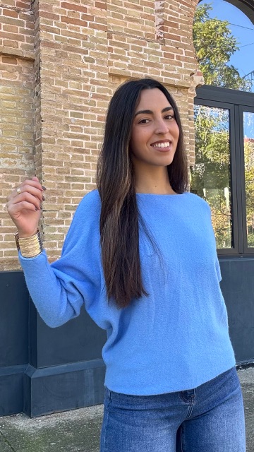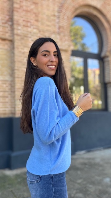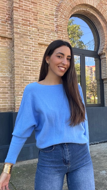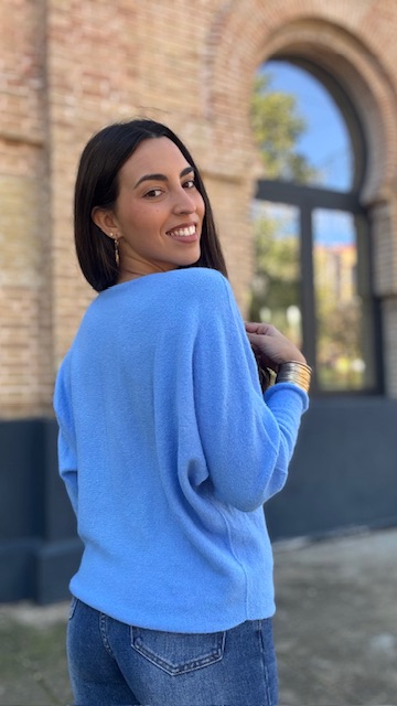 Jersey con cuello barco en color azul azafata. Talla única válida desde la 36 hasta la 44.