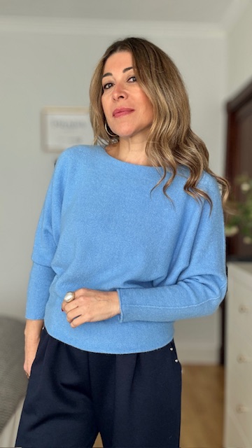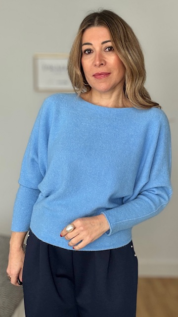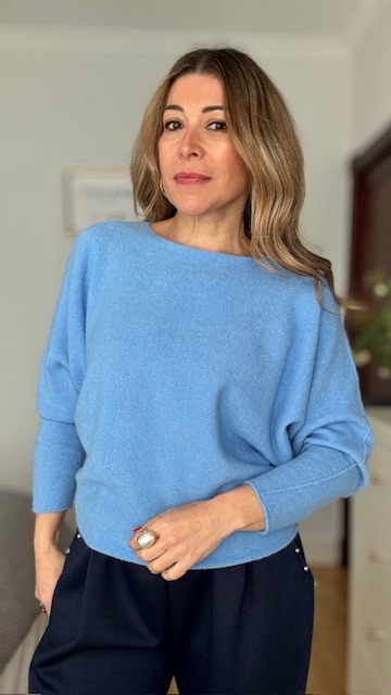 Jersey con cuello barco en color azul. Talla única válida desde la 36 hasta la 44.
