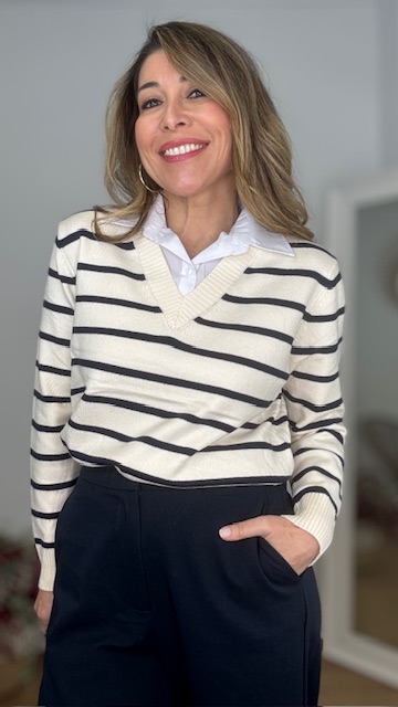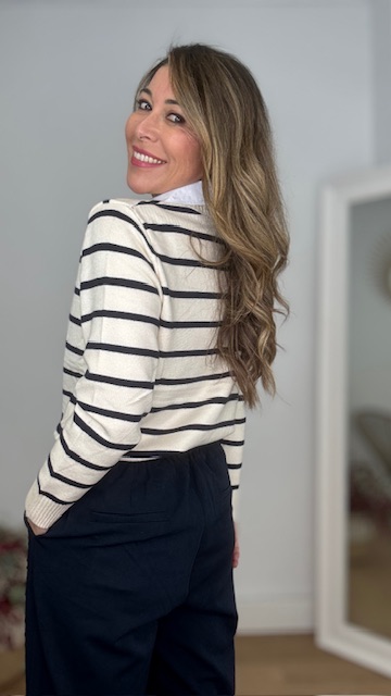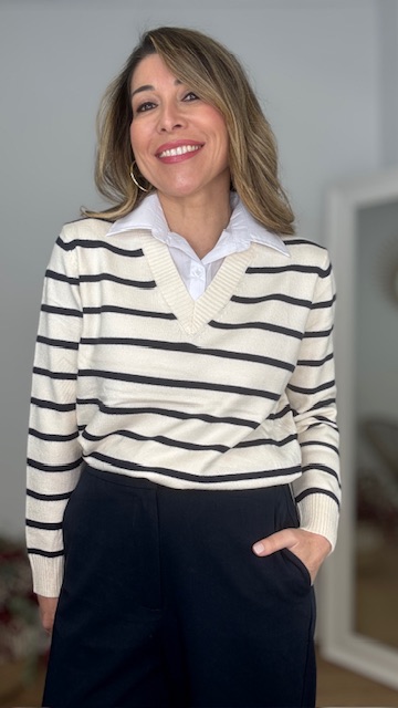 Jersey con cuello de camisa con estampado de rayas en color beige. Talla única válida desde la 36 hasta la 44.