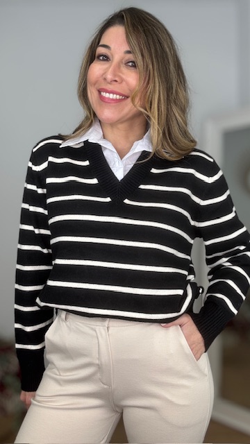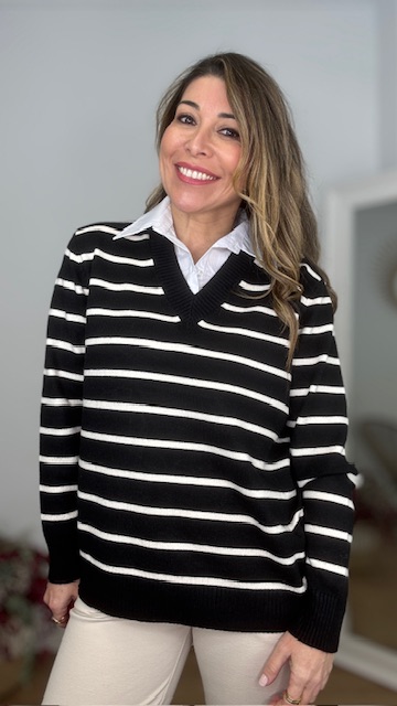 Jersey con cuello de camisa con estampado de rayas en color negro. Talla única válida desde la 36 hasta la 44.