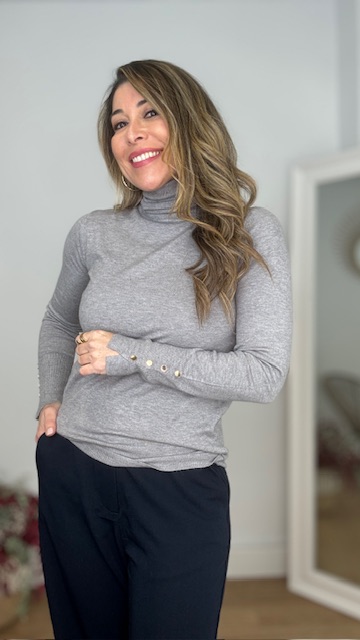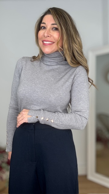 Jersey de punto en color gris con botones dorados en los puños . Talla única válida desde la 36 hasta la 44.