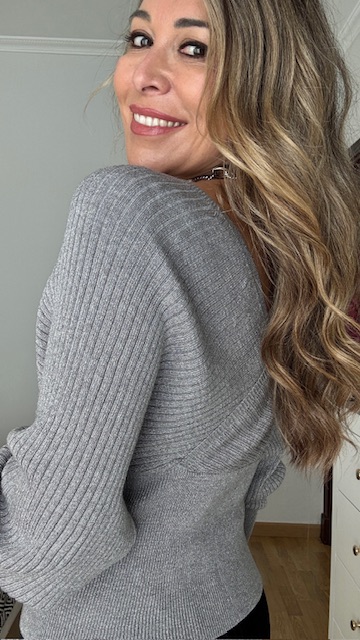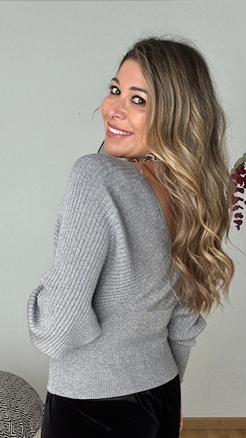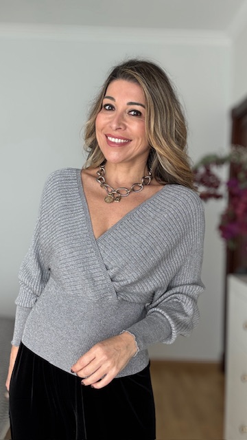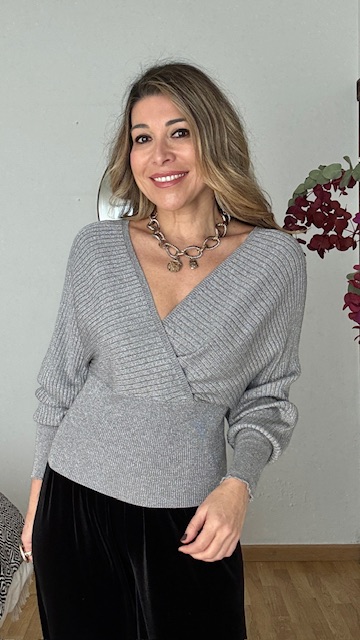 Jersey con escote cruzado en color plateado. Talla única válida desde la 36 hasta la 44.