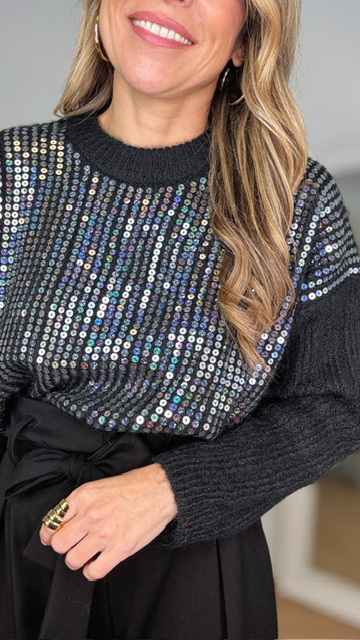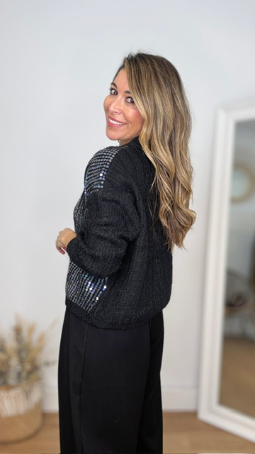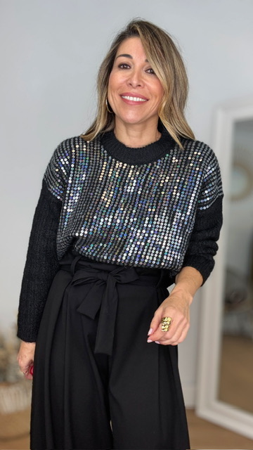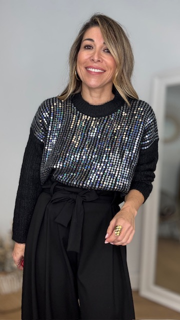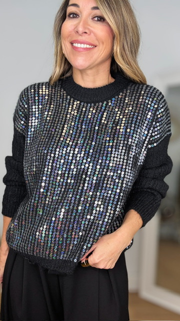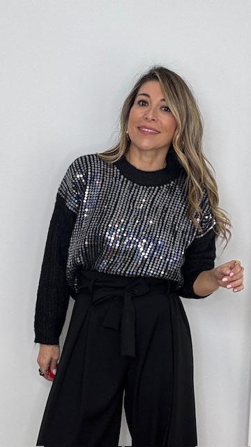 Jersey de lentejuelas plateadas en color negro. Talla única válida desde la 36 hasta la 44.