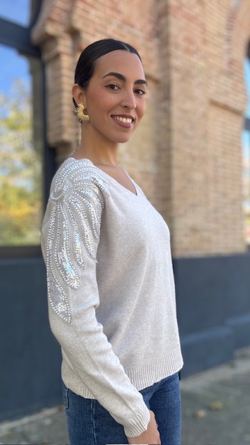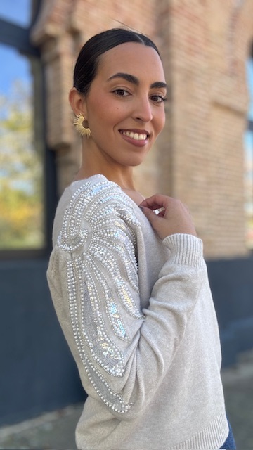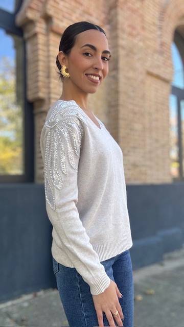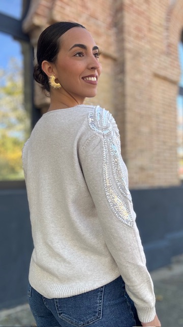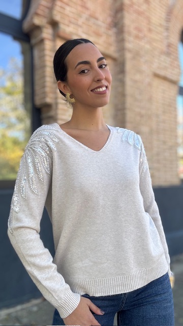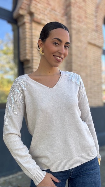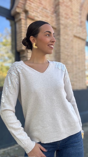 Jersey de punto con dibujo de lentejuelas en color beige. Talla única válida desde la 36 hasta la 44.