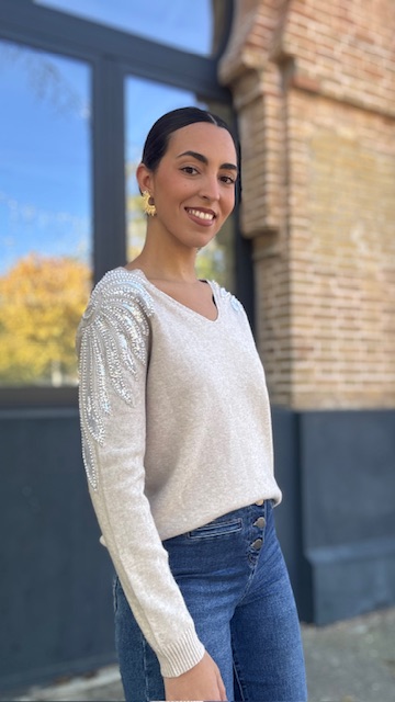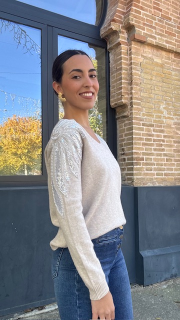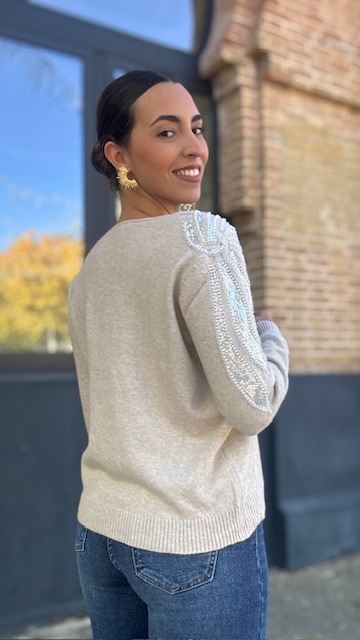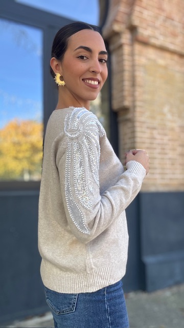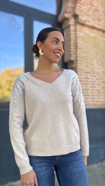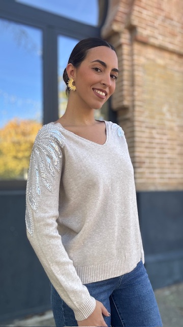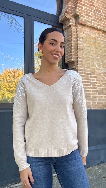Jersey de punto con dibujo de lentejuelas en color camel. Talla única válida desde la 36 hasta la 44.