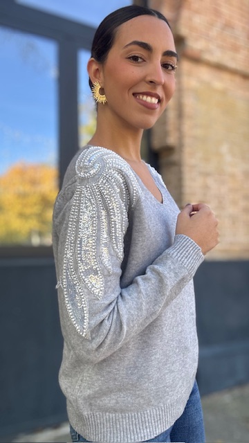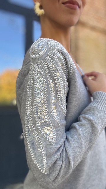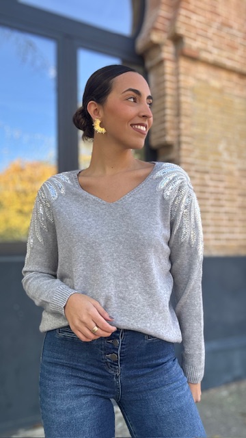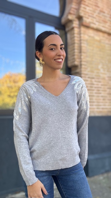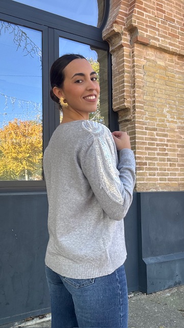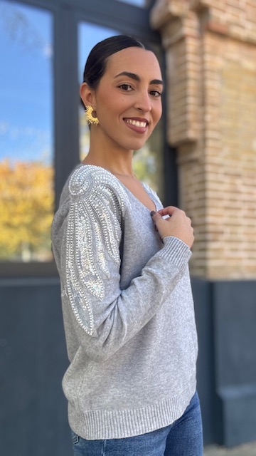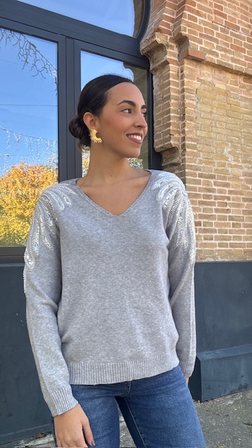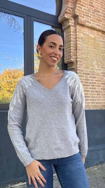 Jersey de punto con dibujo de lentejuelas en color gris. Talla única válida desde la 36 hasta la 44.