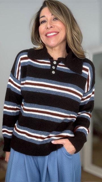 Jersey con cuello polo de rayas en color marrón. Talla única válida desde la 36 hasta la 44.