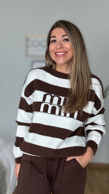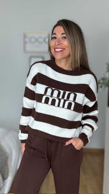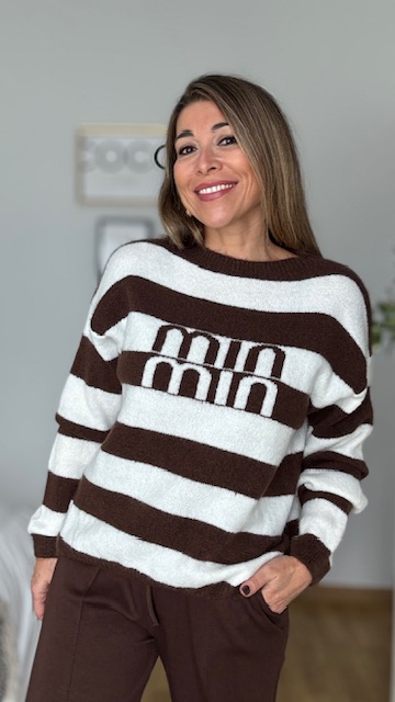 Jersey con estampado rayas en marrón y blanco con dibujo en la parte delantera del jersey. Talla única válida desde la 36 hasta la 44.