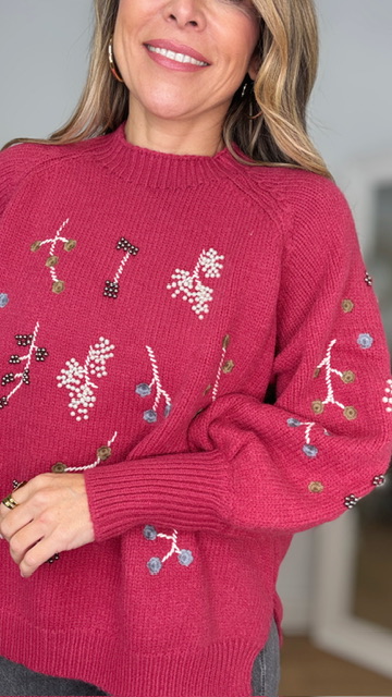 Jersey en color rosa empolvado de punto con detalles en relieves y bordados. Talla única válida desde la 36 hasta la talla 44.