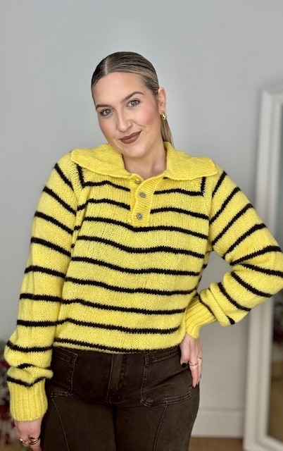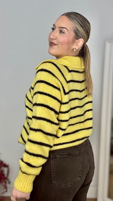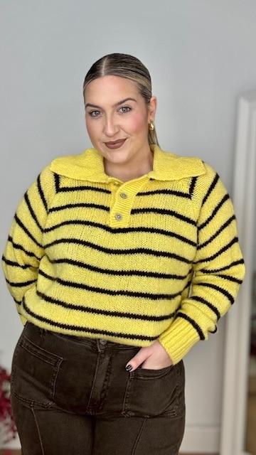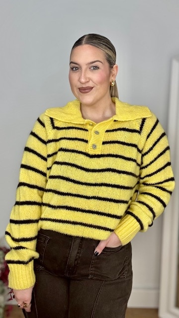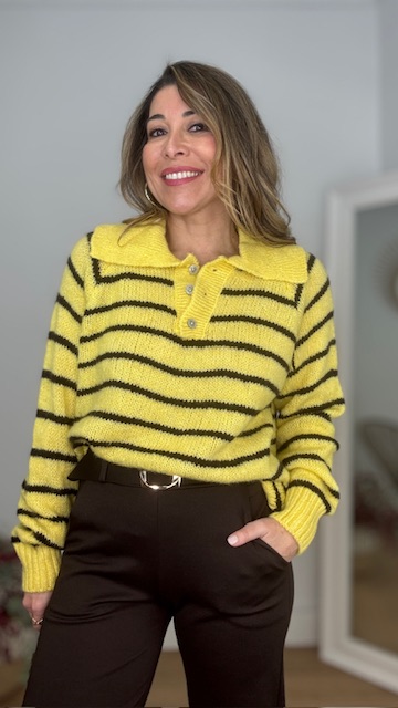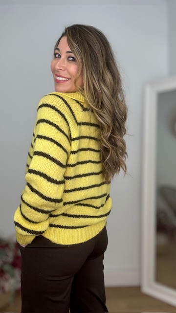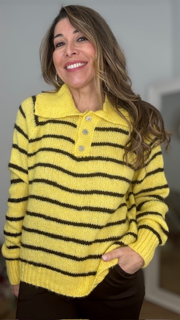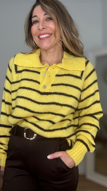 Jersey estilo polo en color amarillo con raya en color marrón. Talla única válida desde la 36 hasta la 44.