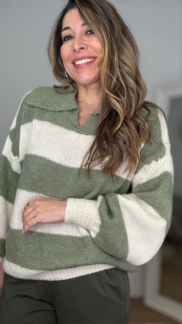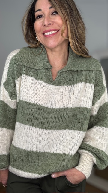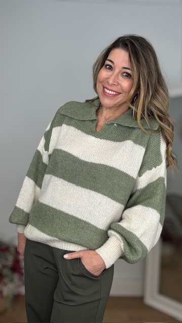 Jersey estilo polo con estampado de rayas en color verde caza y beige. Talla única válida desde la 36 hasta la 44.