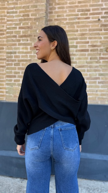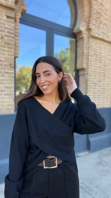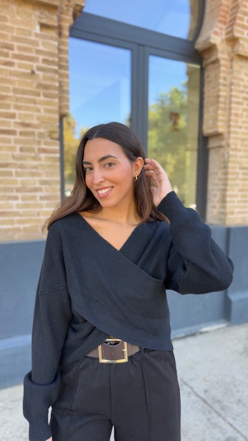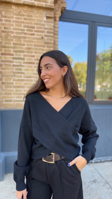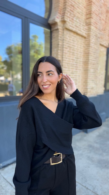 Jersey confeccionado en tejido de punto con escote cruzado en color negro. Lo puedes usar con el cruce tanto por delante como por detrás. Talla única válida desde la 36 hasta la 44.
