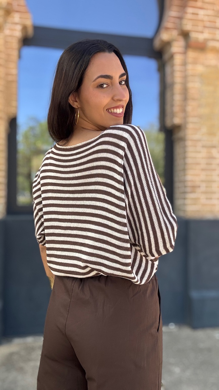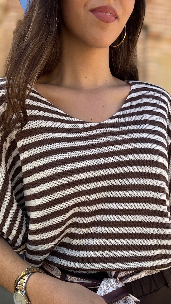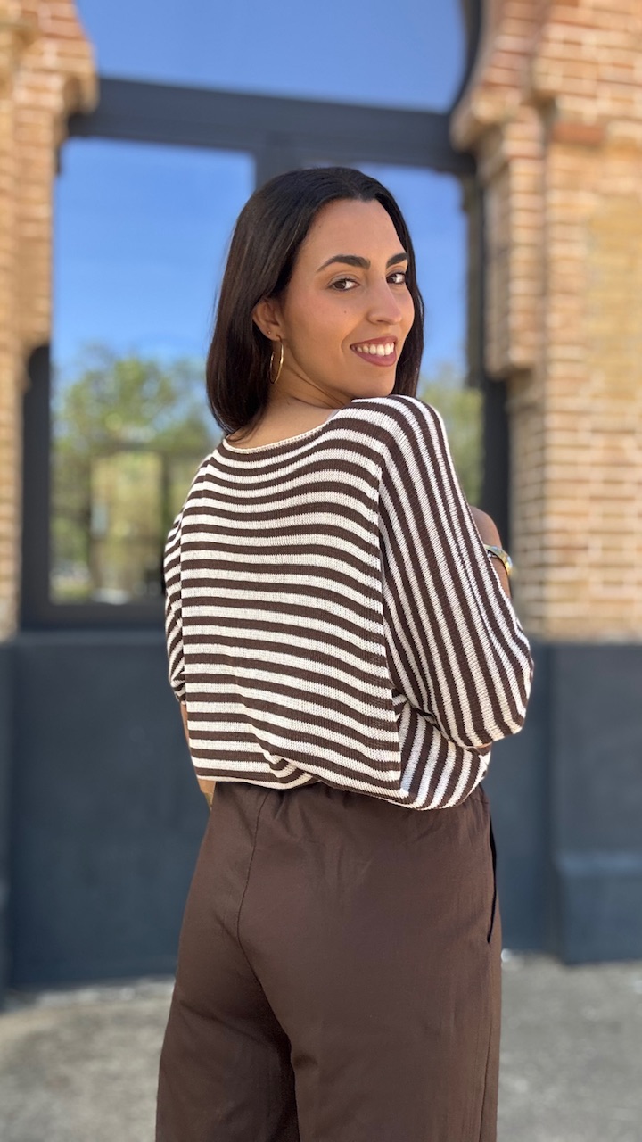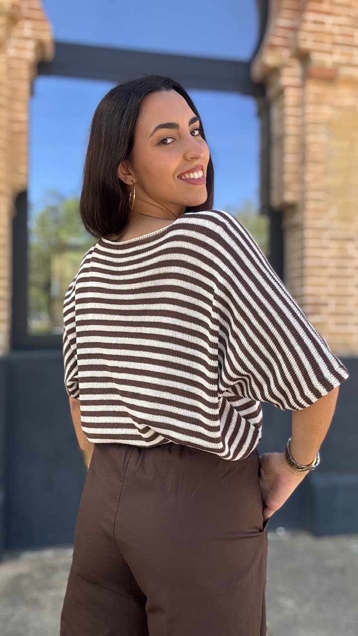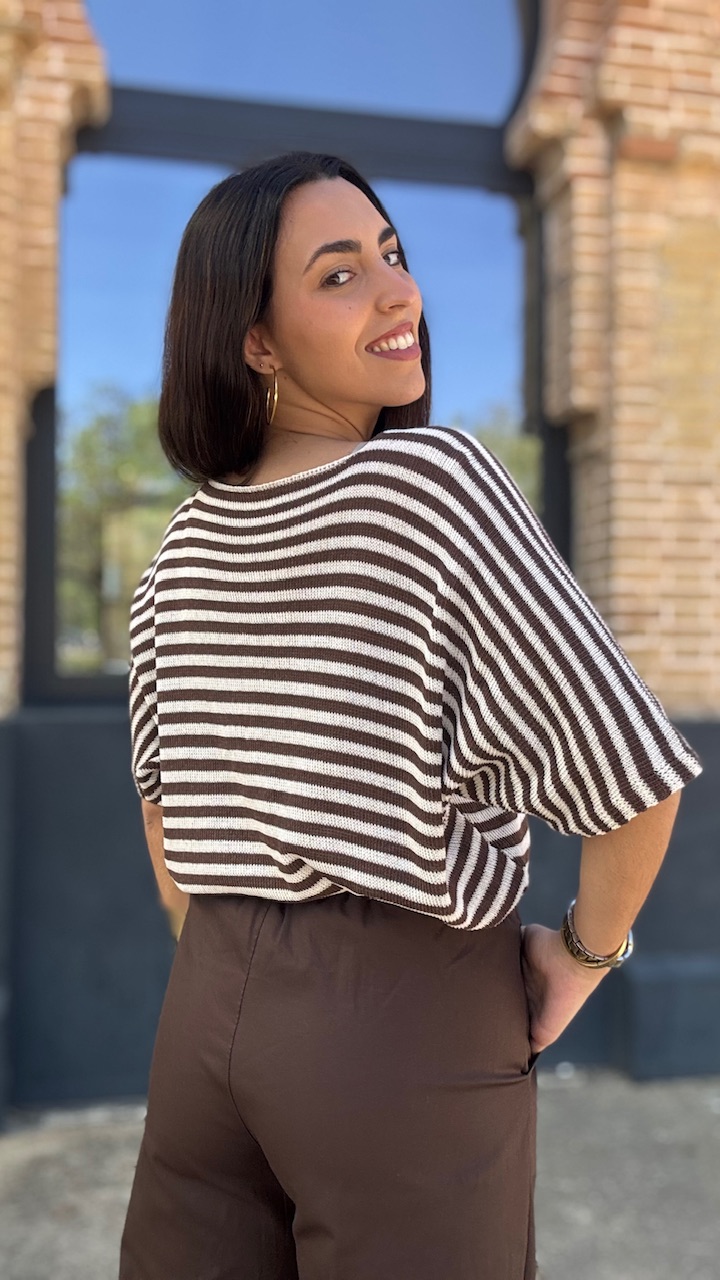 Jersey de punto de hilo de manga corta con cuello barco con estampado de rayas horizontales en beige y marrón Talla única válida desde hasta la talla 36 hasta la 44.