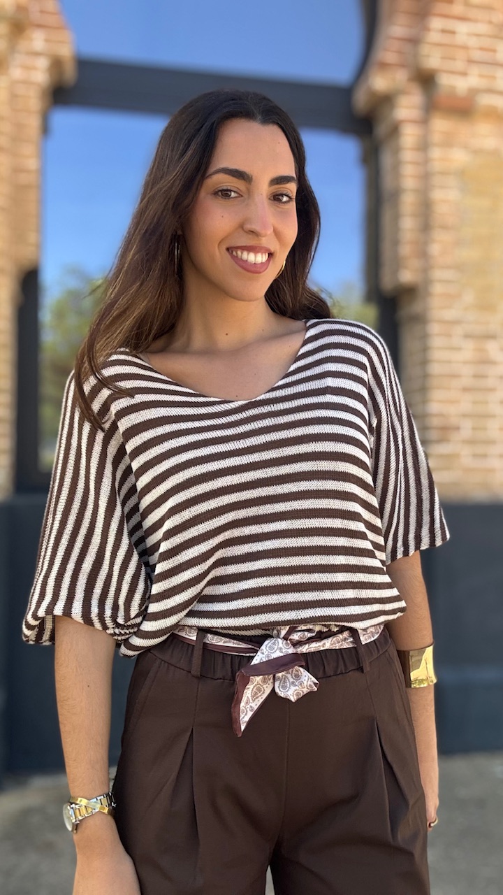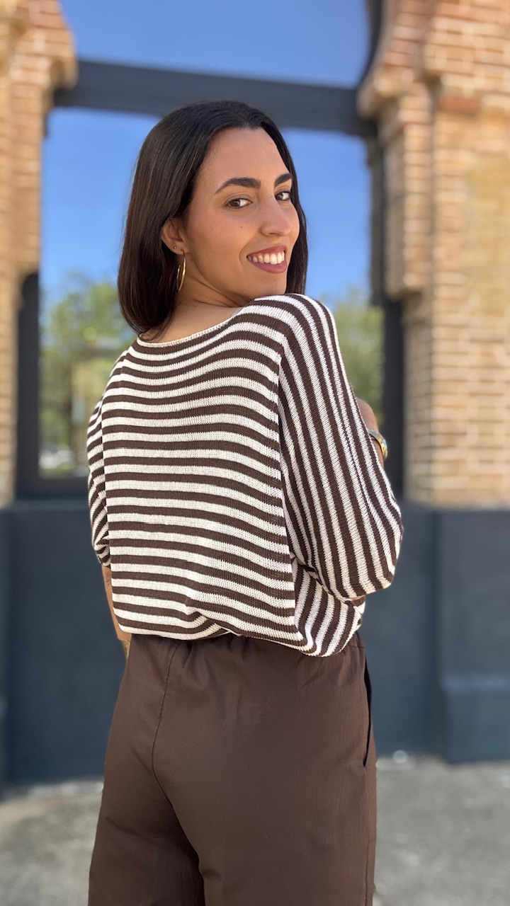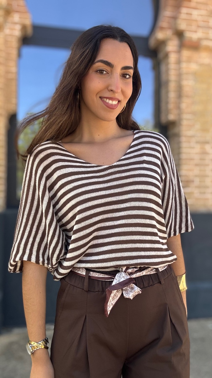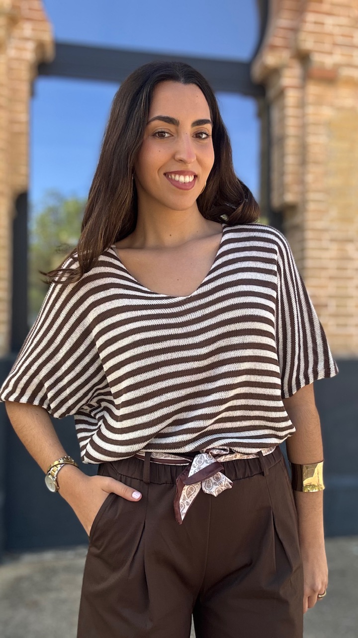 Jersey de punto de hilo de manga corta con cuello barco con estampado de rayas horizontales en beige y marrón Talla única válida desde hasta la talla 36 hasta la 44.