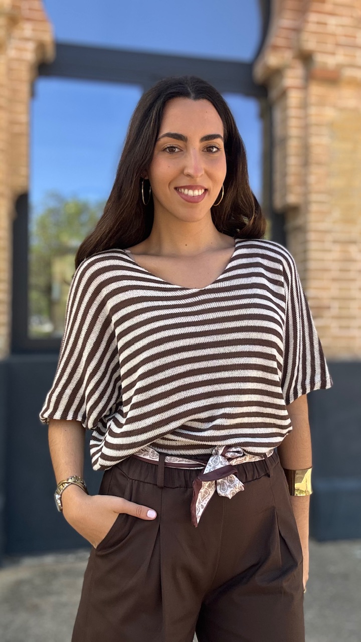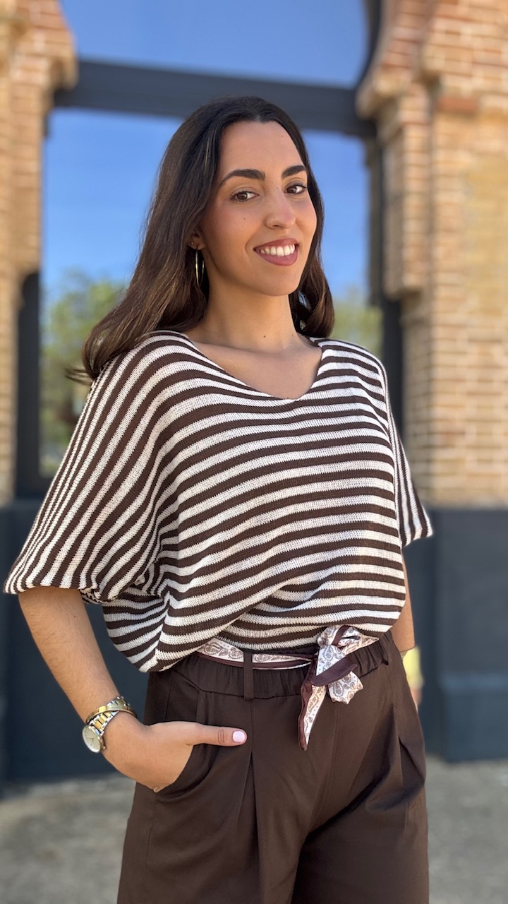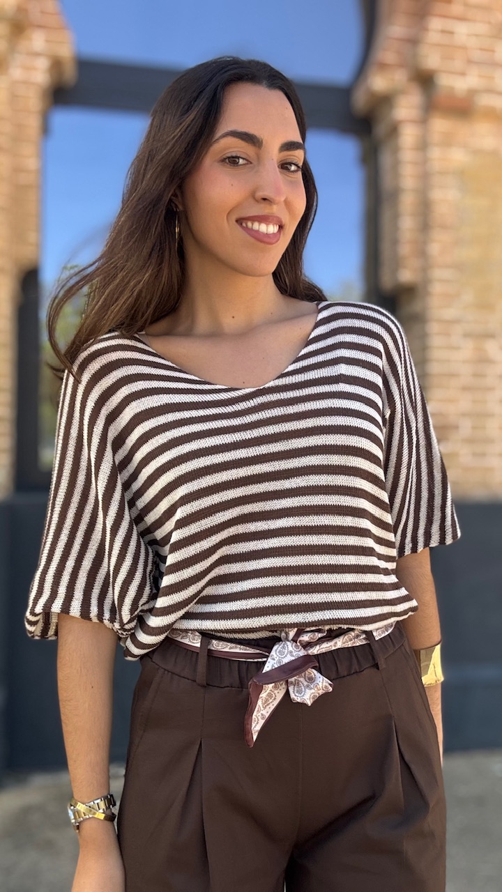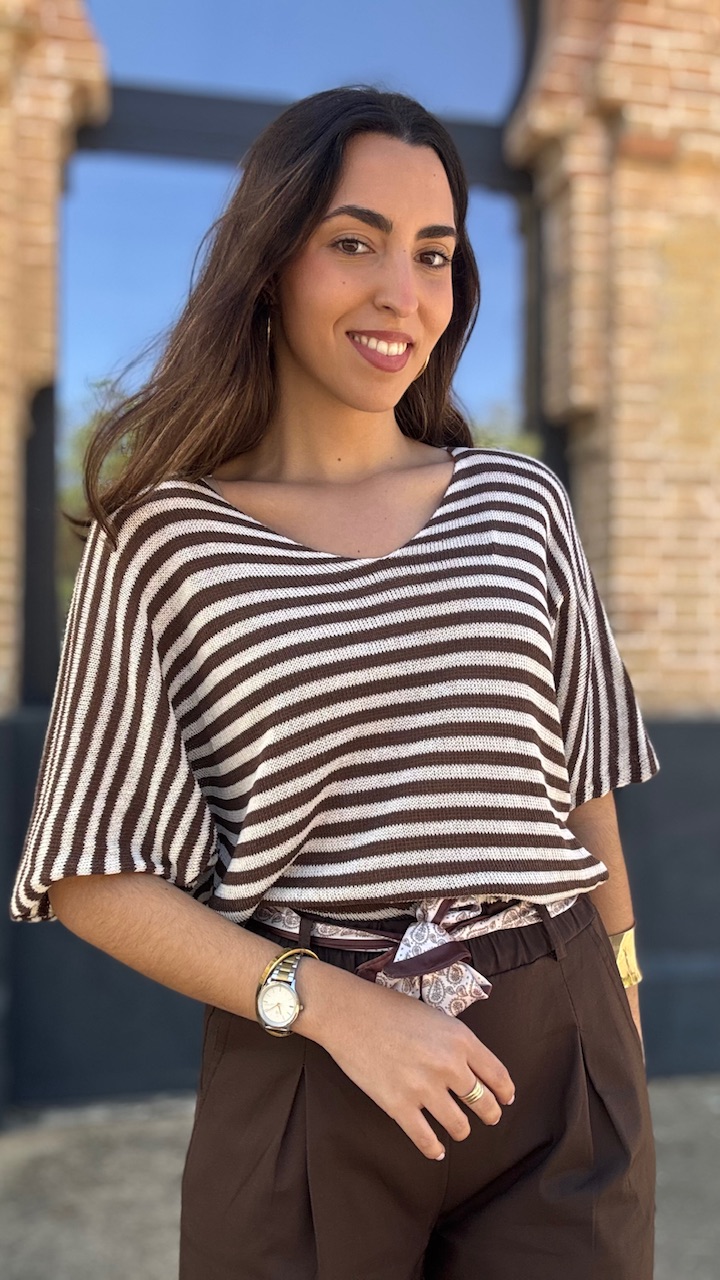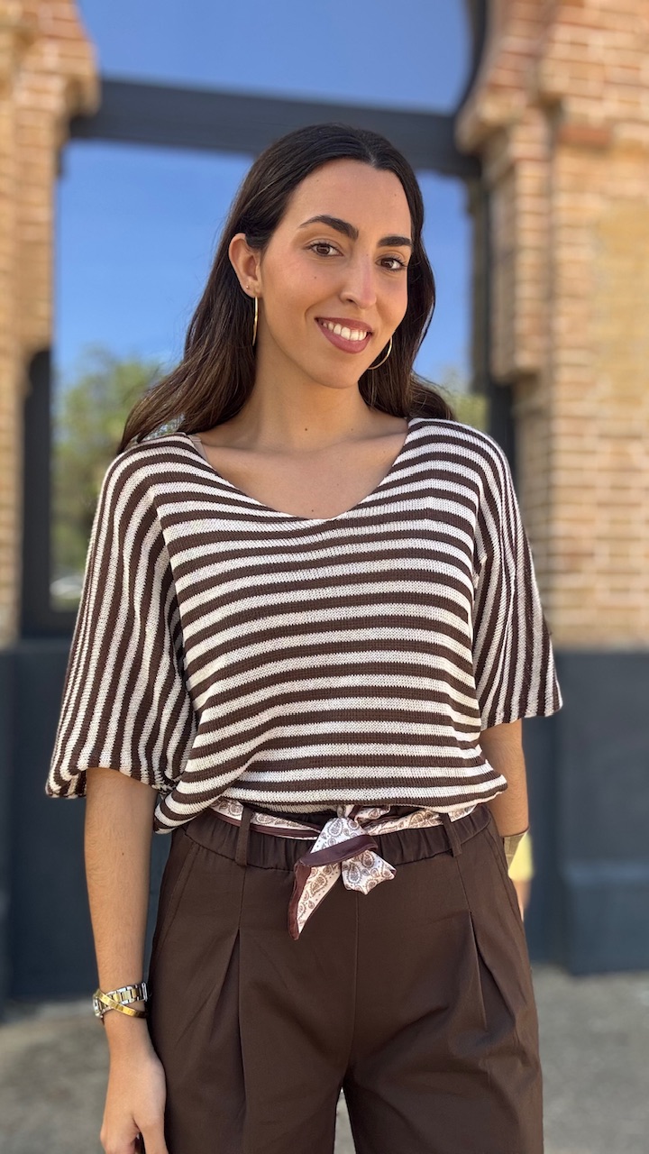 Jersey de punto de hilo de manga corta con cuello barco con estampado de rayas horizontales en beige y marrón Talla única válida desde hasta la talla 36 hasta la 44.