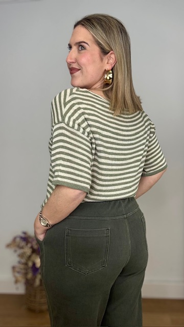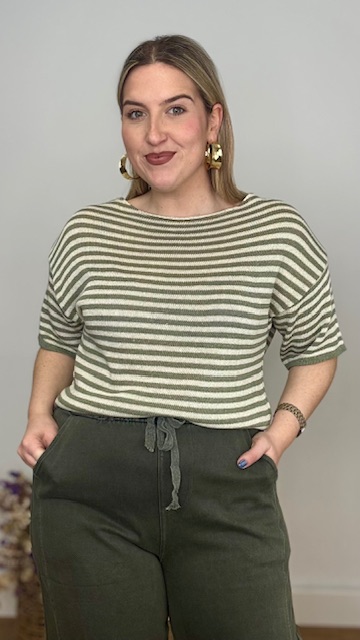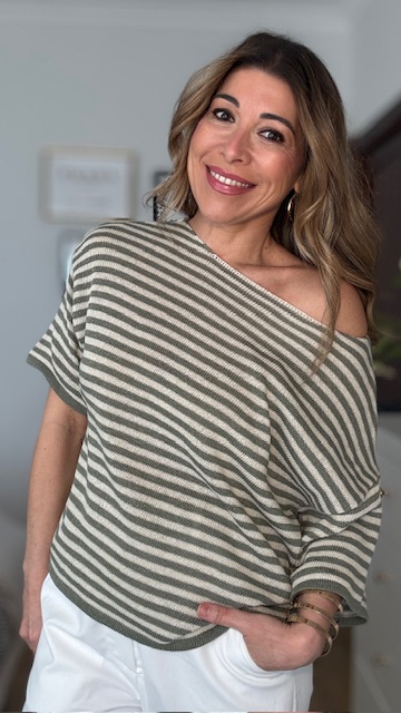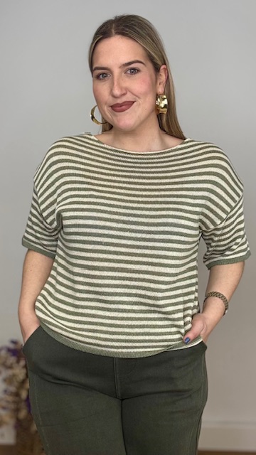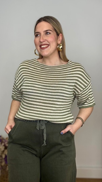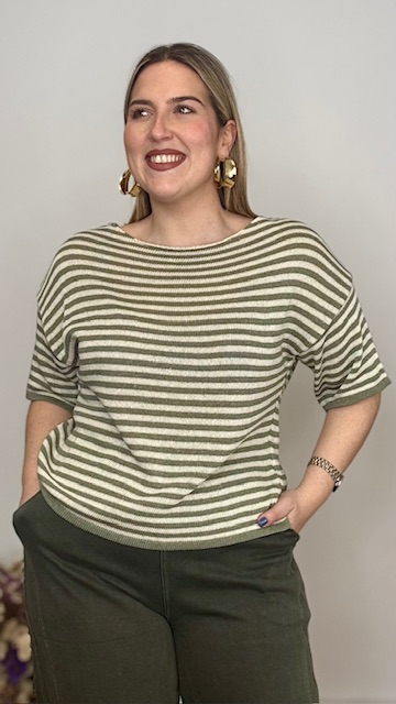 Jersey de punto de hilo de manga corta con cuello barco con estampado de rayas horizontales en beige y verde caza. Talla única válida desde hasta la talla 36 hasta la 44.