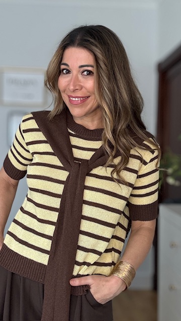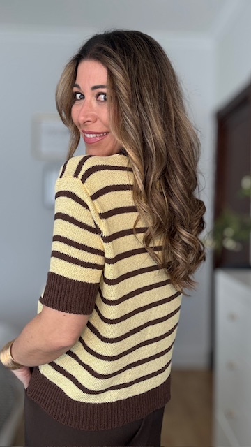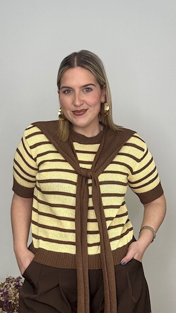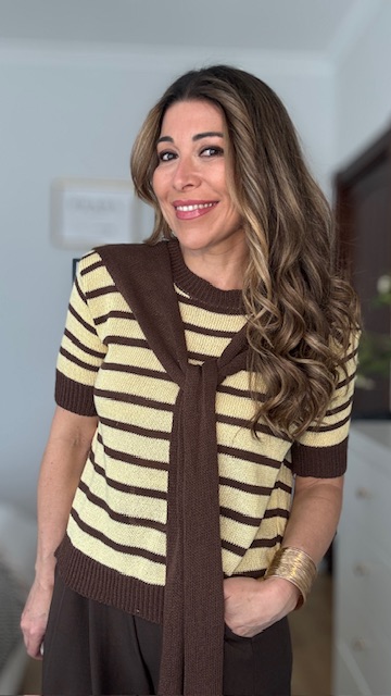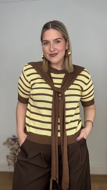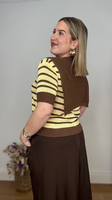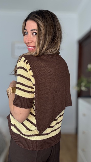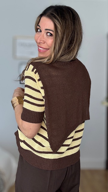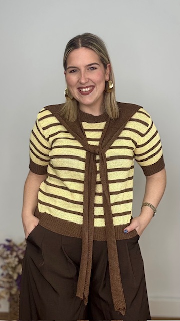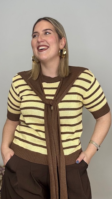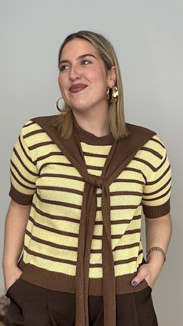 Jersey confeccionado en tejido de punto de hilo con cuello redondo y estampado de rayas horizontales en marrón y amarillo. Incluye pañuelo de punto de hilo en color marrón. Talla única válida desde la talla 36 hasta la talla 44.