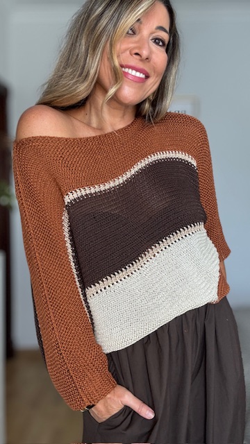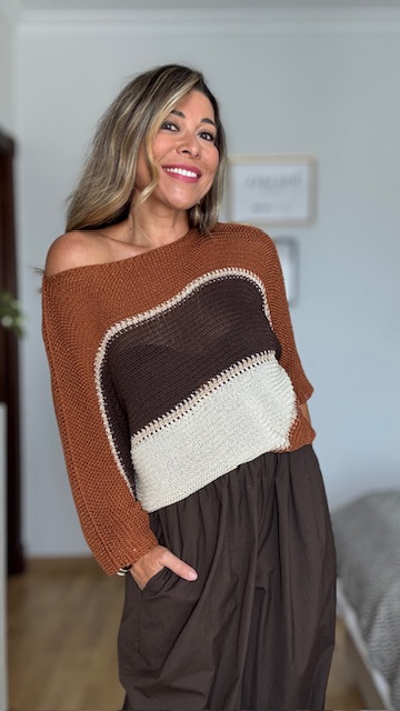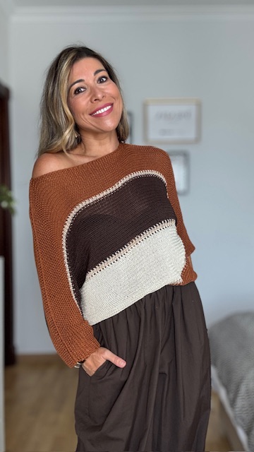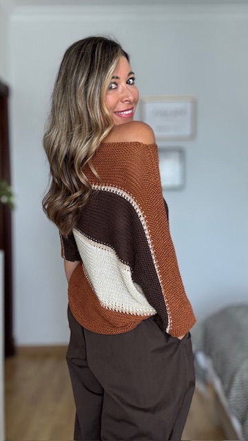 Jersey de punto de hilo de algodón con rayas de tres colores, teja, marrón y blanco roto, con detalles en dorado. Talla única válida desde la 36 hasta la 44.