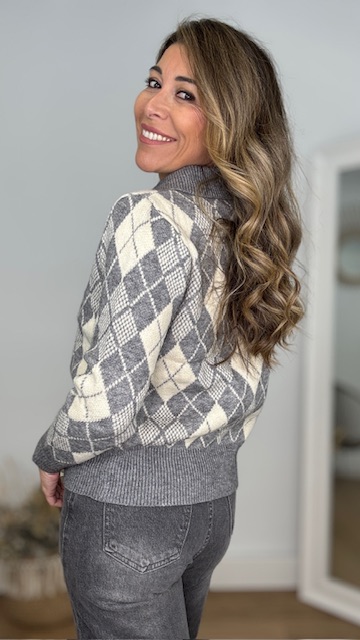 Jersey confeccionado en tejido de punto con estampado de rombos en color beige y gris. Talla única válida desde la 36 hasta la 44.