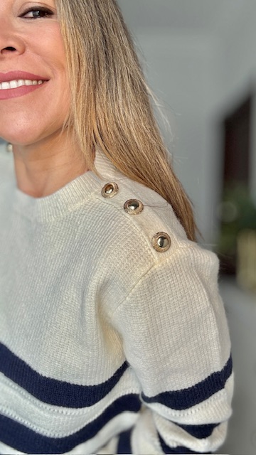 Jersey con estampado de rayas en color beige y azul marino con botones dorados en la parte de los hombros. Talla única válida desde la 36 hasta la 44.