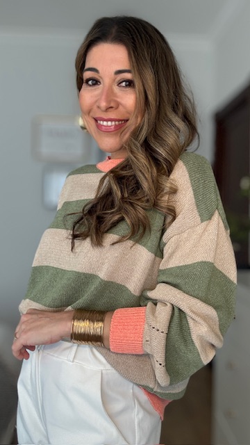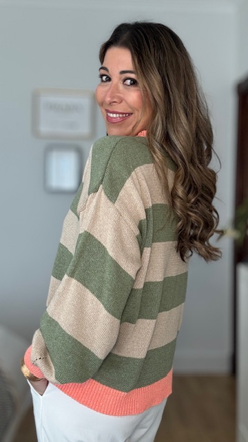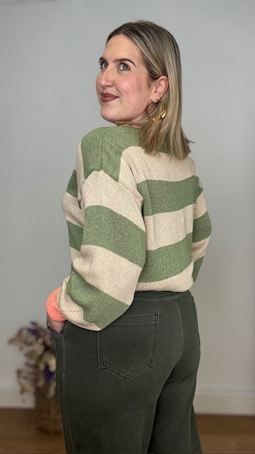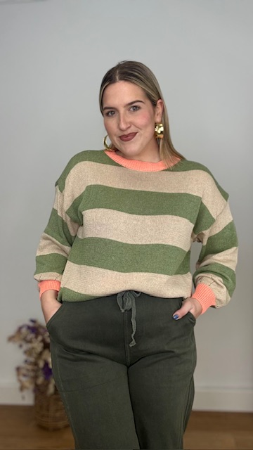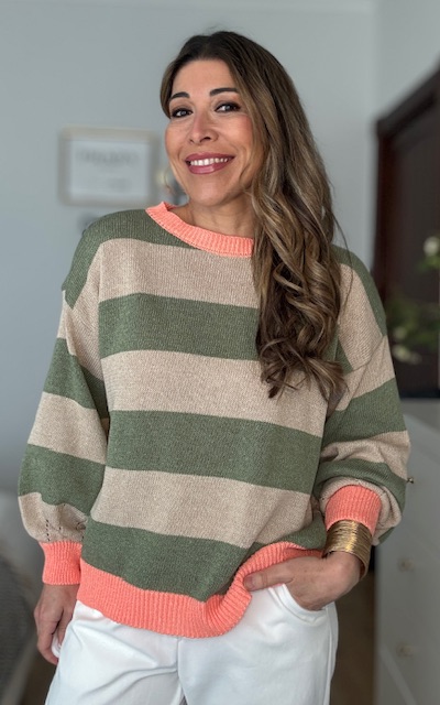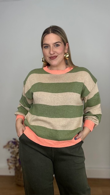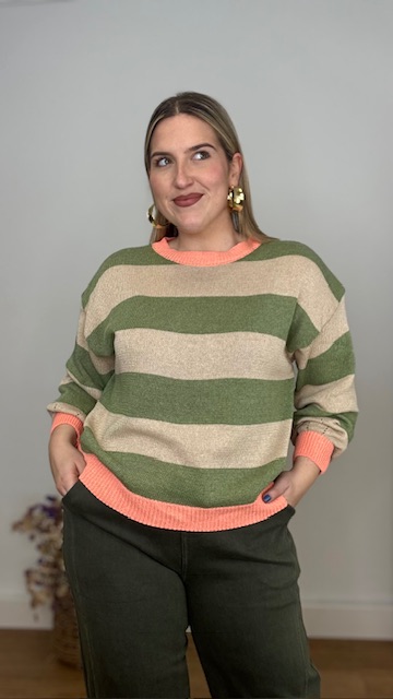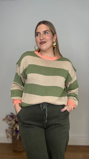 Jersey con estampado de rayas horizontales en color beige y verde caza con cuello redondo y puños en color mandarina . Talla única válida desde la talla 36 hasta la talla 44.