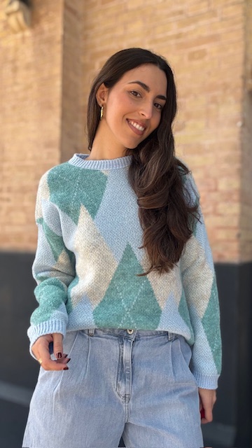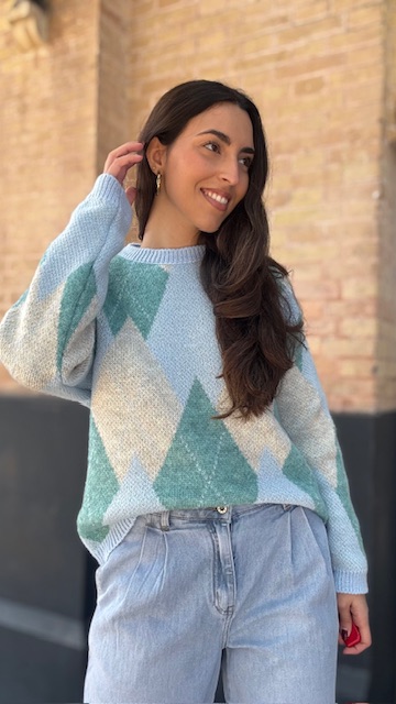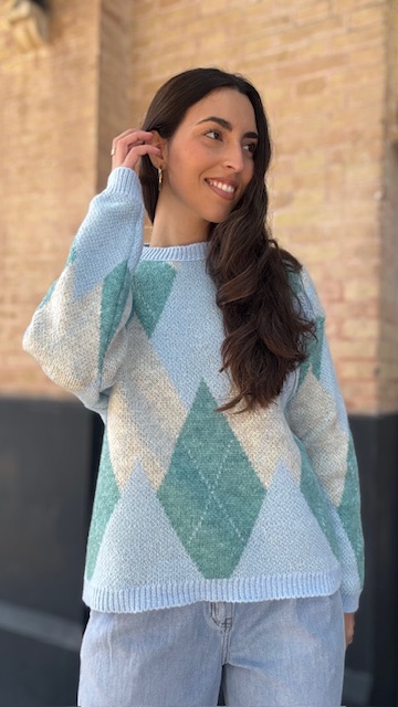 Jersey con estampado de rombos en color azul y gris. Talla única válida desde la 36 hasta la 44.