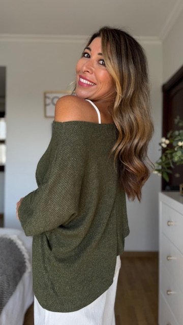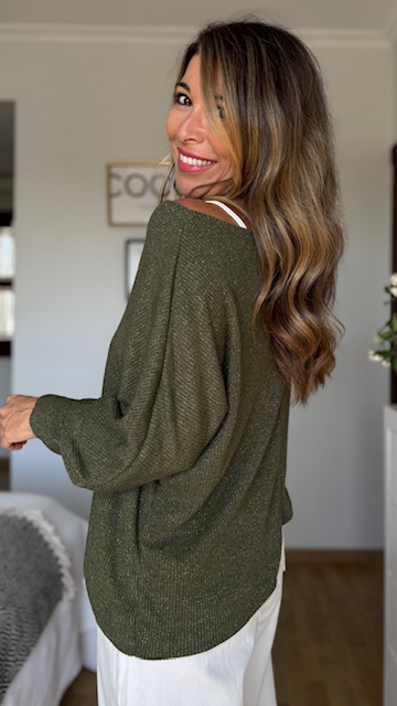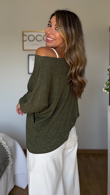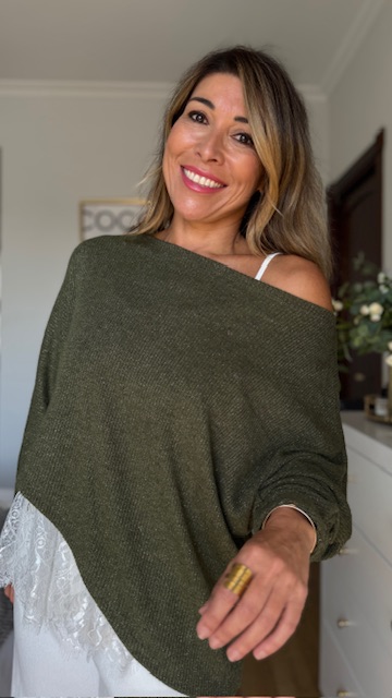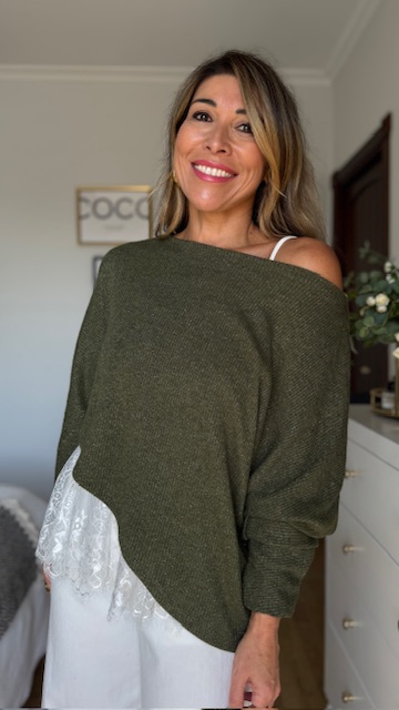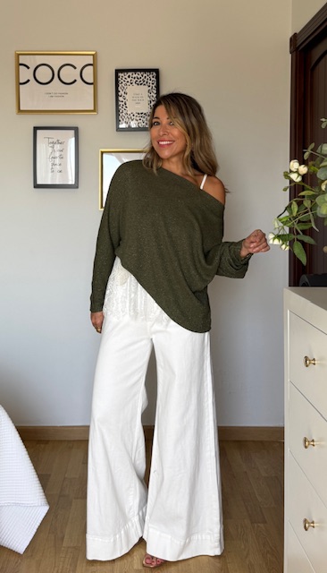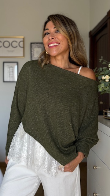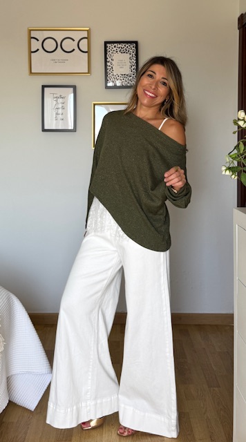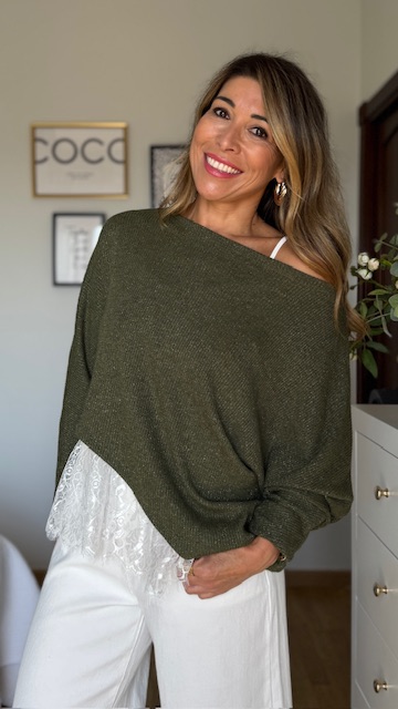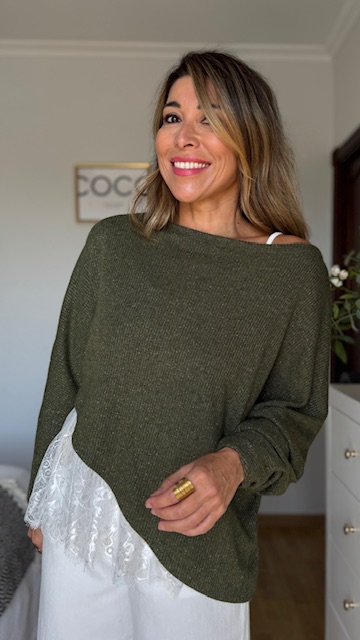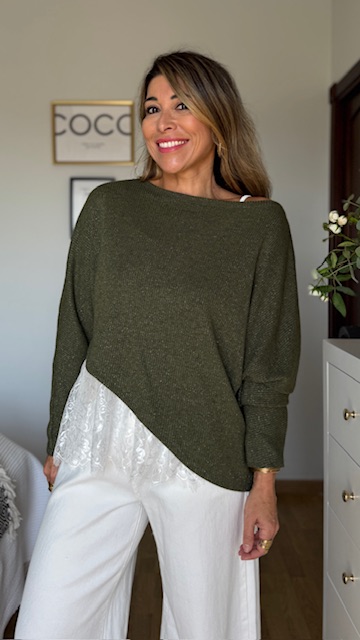 Jersey asimétrico en color verde caza con top de encaje abajo en color blanco. Talla única válida desde la 36 hasta la 44.