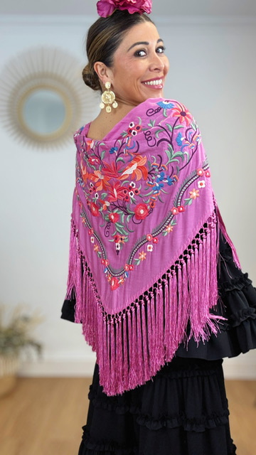 Mantón de seda en color rosa con bordados de colores. Tamaño adulto.
