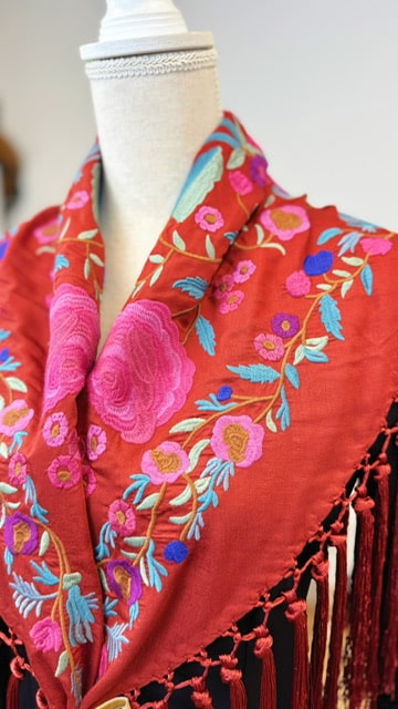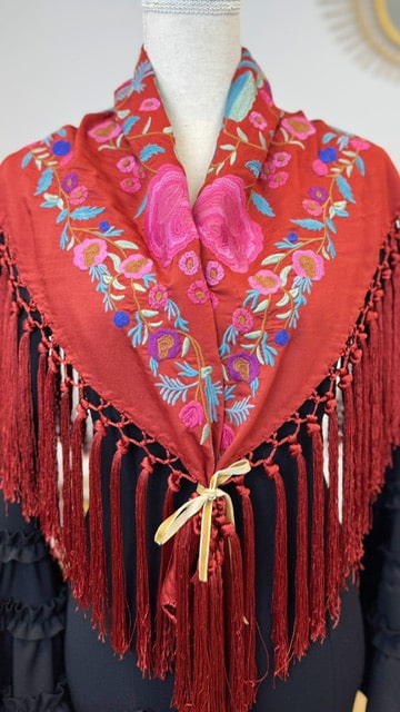 Mantón de confeccionado bordado en flores de colores con flecos cortos en color teja. Talla mediana.