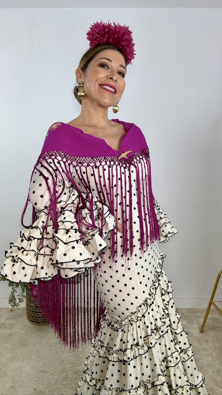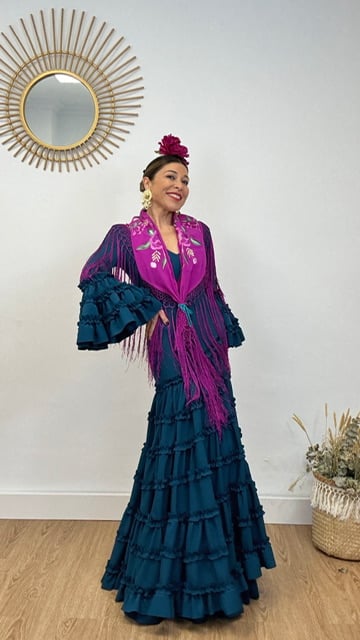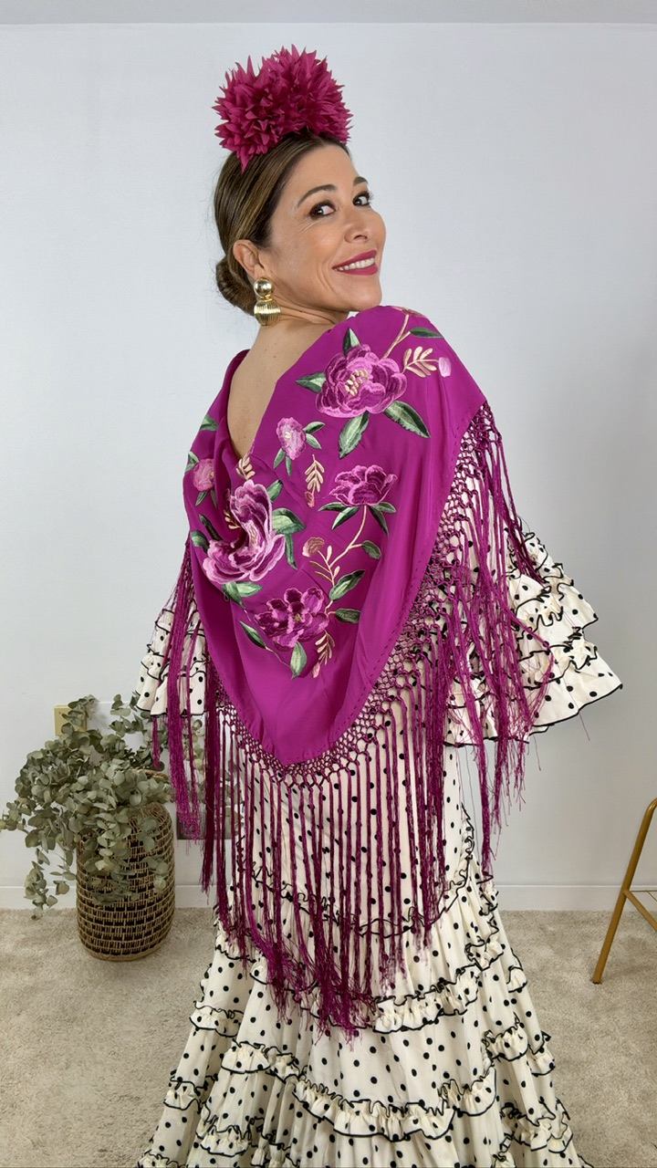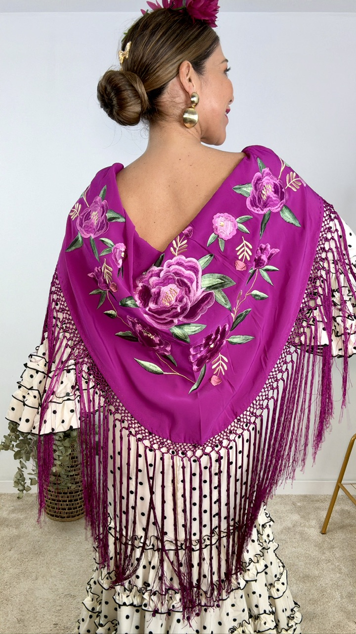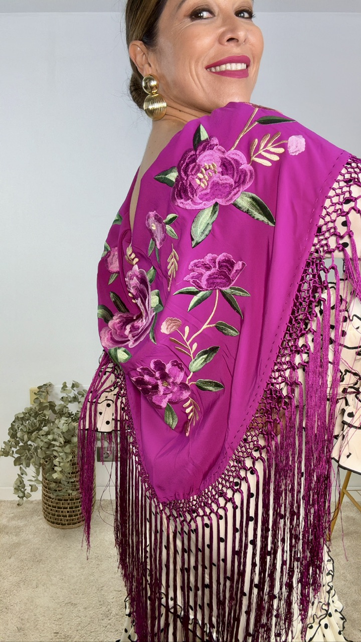Mantón de flamenca confeccionado en tejido de seda en color buganvilla con bordados estampados en diferentes tonos en la misma gama de colores. Tamaño de adulto.