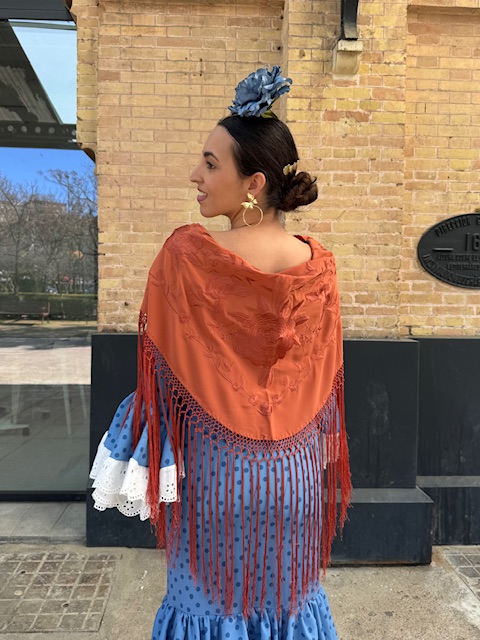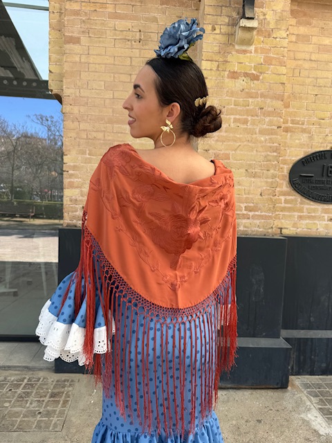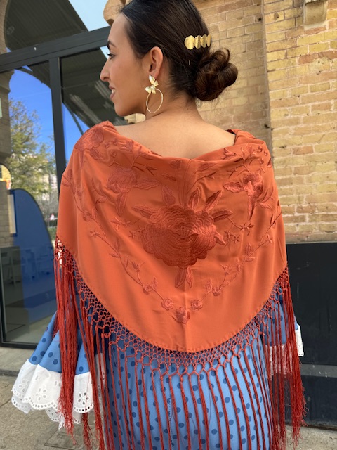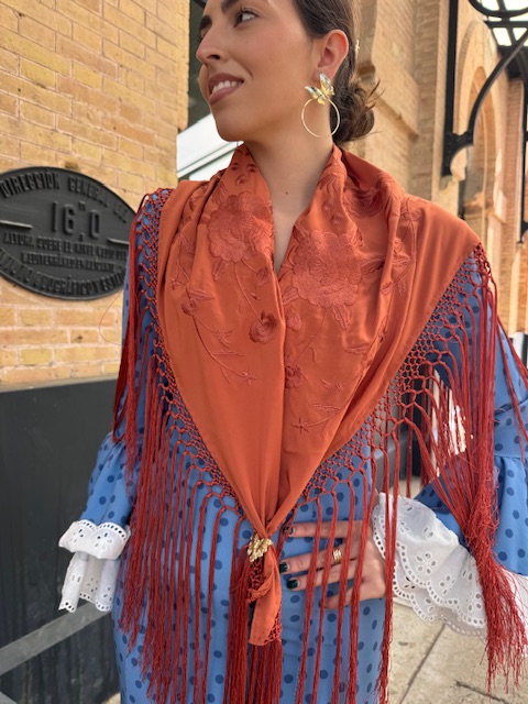 Mantón bordado en color teja con flecado largo.