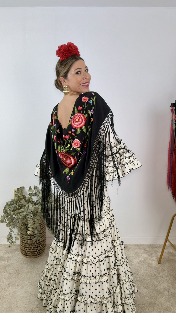 Mantón de flamenca confeccionado en tejido de seda en color negro con bordados de flores en distintos colores . Tamaño de adulto.