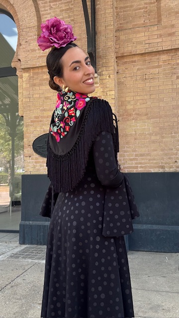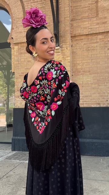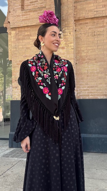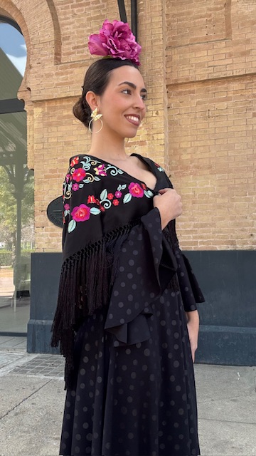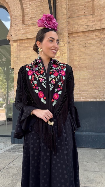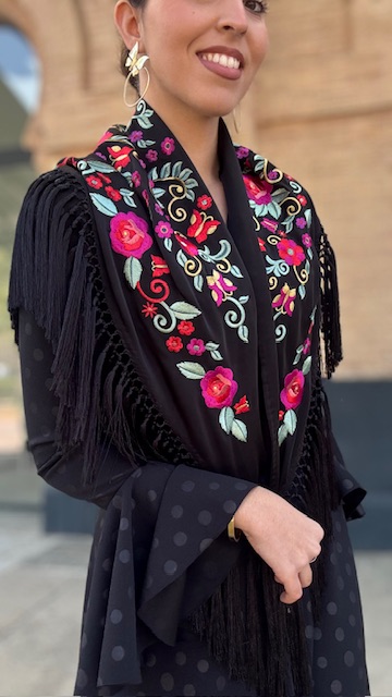 Mantón con bordado en tonos multicolor en color negro. Confeccionado en Cantillana (Sevilla).