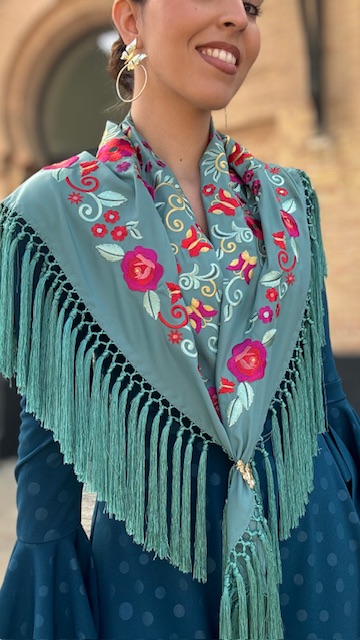 Mantón con bordado en tonos multicolor en color verde jabonoso.