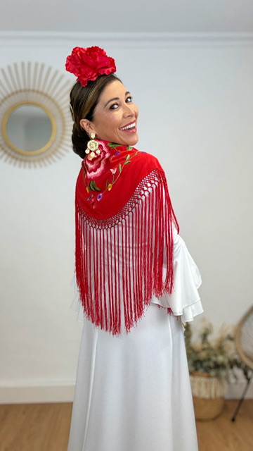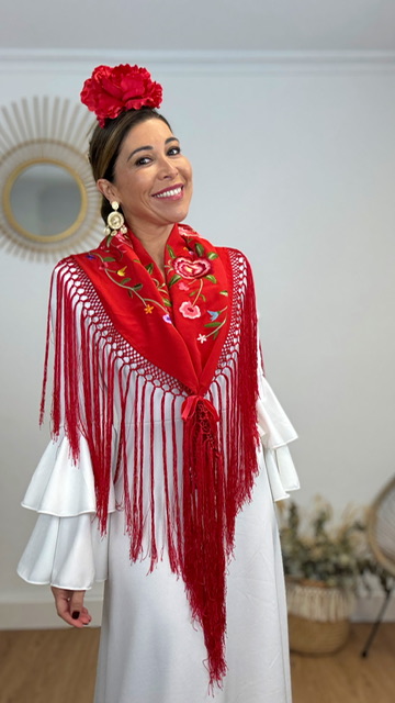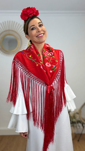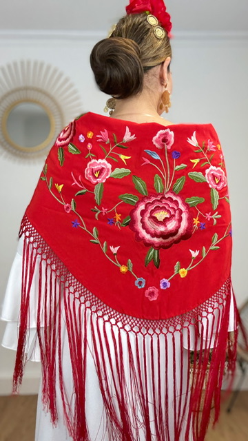 Mantón de flamenca confeccionado en seda en color rojo con bordados estampados en diferentes colores. Tamaño de adulto.