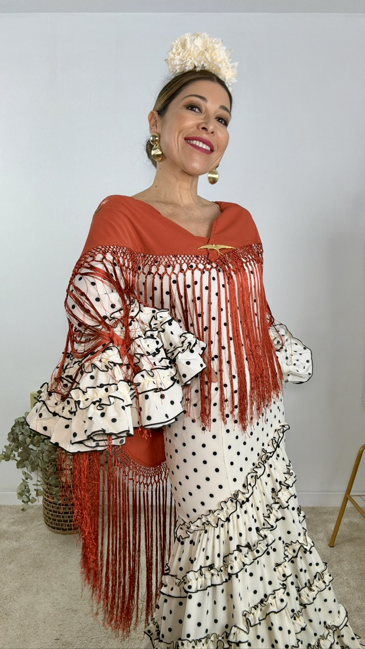 Mantón de flamenca en color teja con bordados estampados en distintos colores. Tamaño de adulto.