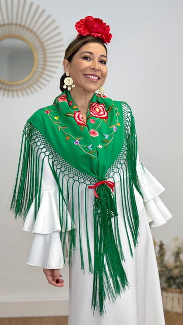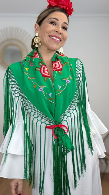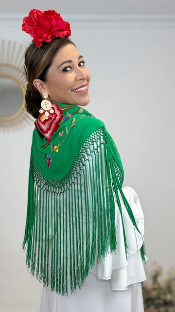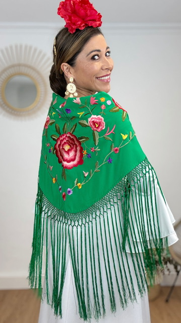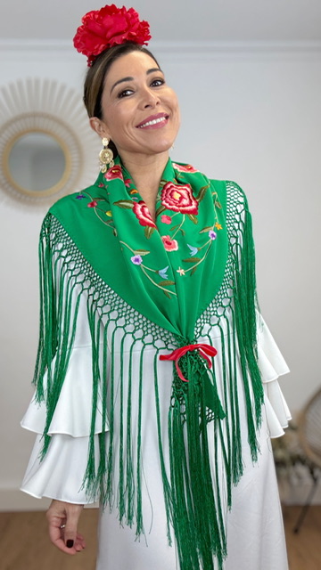 Mantón de flamenca confeccionado en tejido de seda en color verde Andalucía y bordado con flores de colores. Tamaño de adulto.