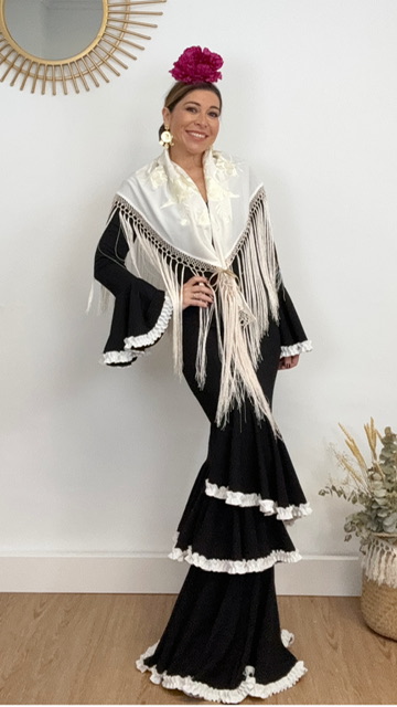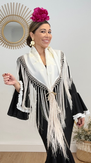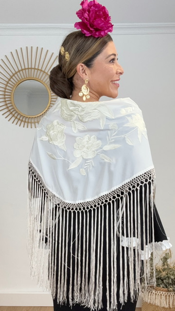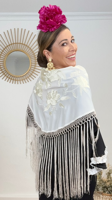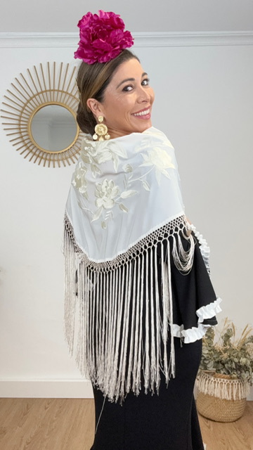 Mantón de flamenca confeccionado en tejido de seda en color beige con bordado de flores en el mismo color. Tamaño de adulto.