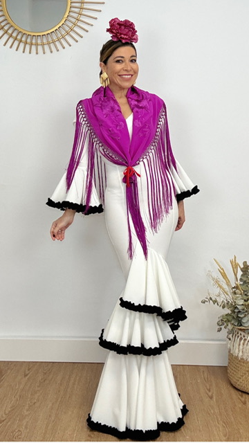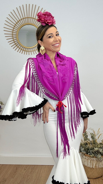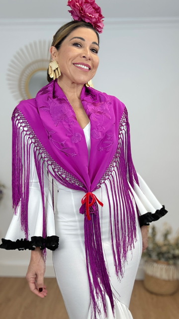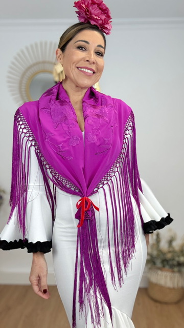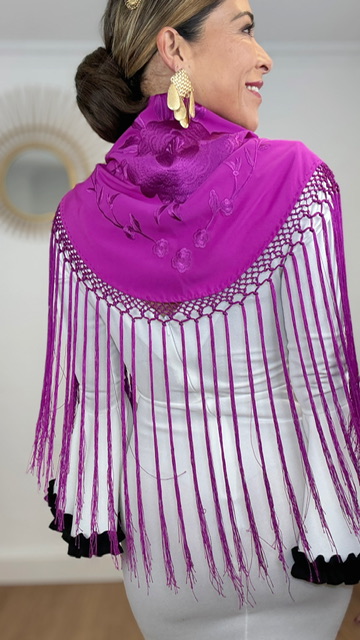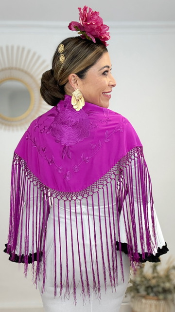 Mantón de flamenca confeccionado en tejido de seda en color buganvilla con bordado de flores en el mismo color. Tamaño de adulto.