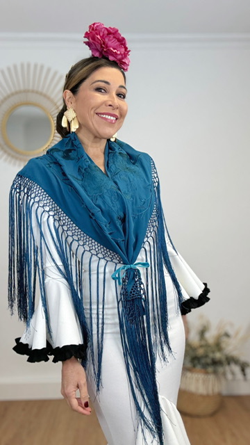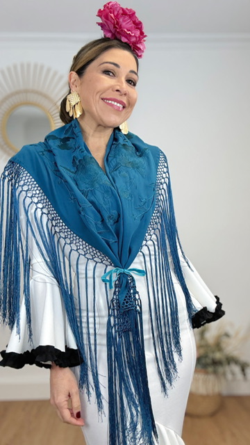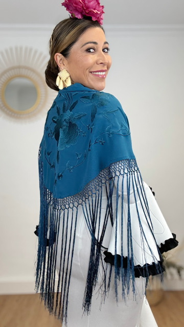 Mantón de flamenca confeccionado en tejido de seda en color petróleo con bordado de flores en el mismo color. Tamaño de adulto.