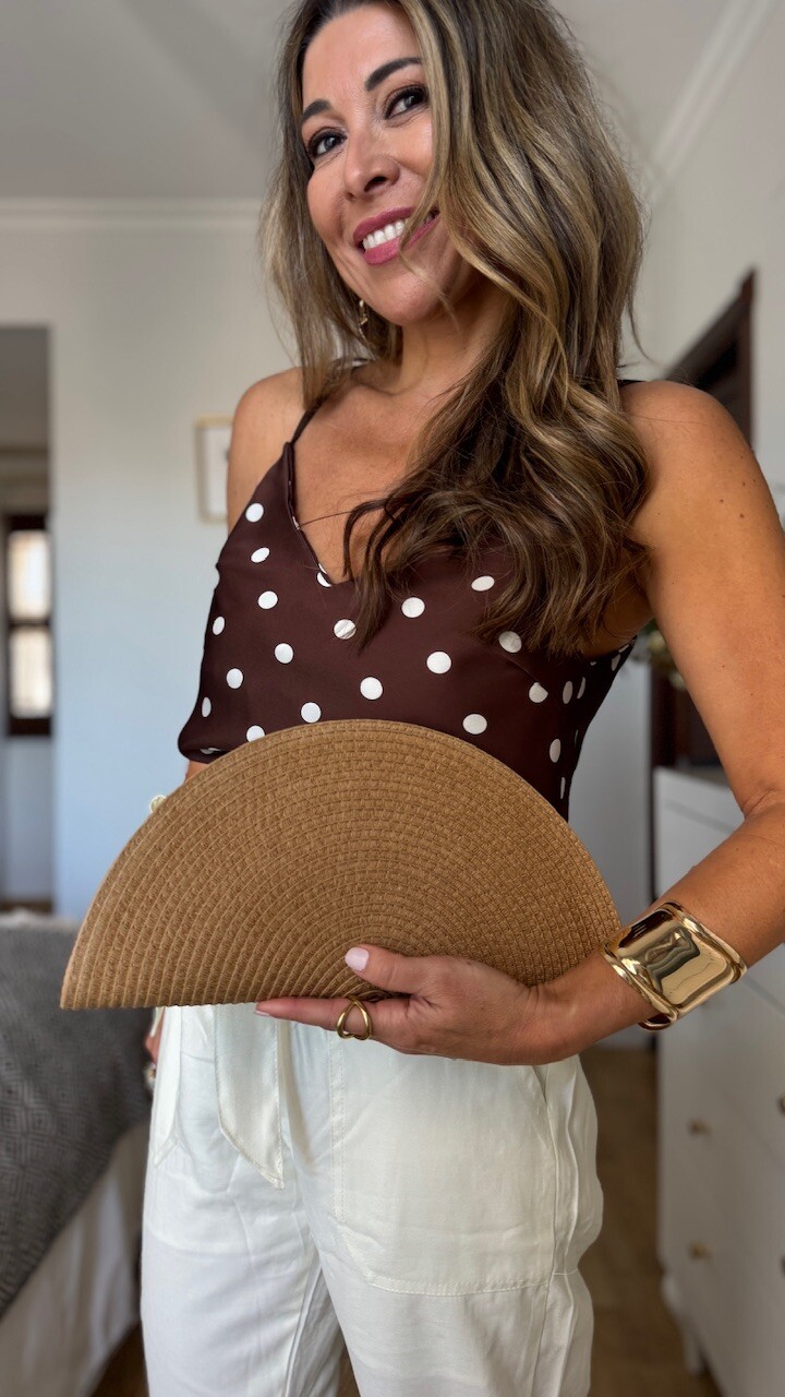 Cartera de rafia en color natural en forma de abanico con cadena dorada en su interior. 31 cm de largo – 16 cm de ancho.