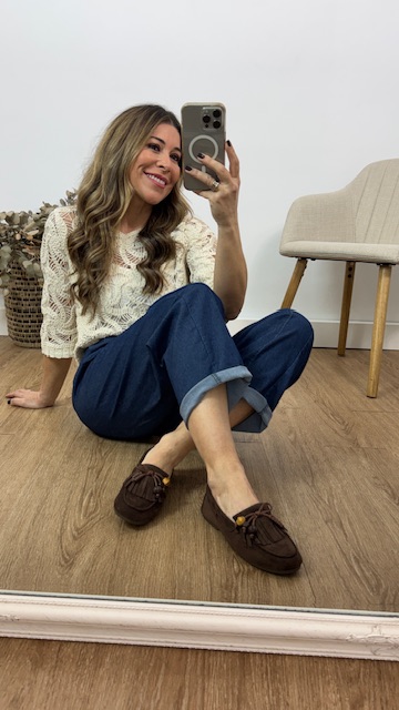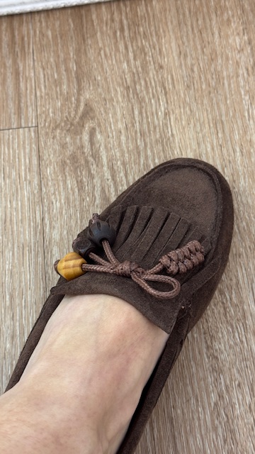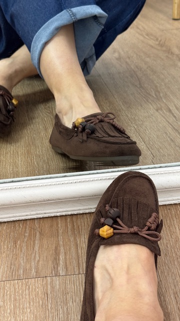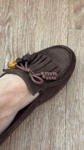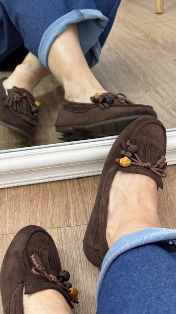 Mocasín de antelina en color marrón chocolate con detalle de flecos y borlón en la pala delantera. Tallan normal, pero si tienes el pie delgado recomendamos una talla menos para que no te quede desbocado.