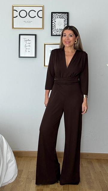 Mono confeccionado en tejido de poliéster con cremallera invisible en la parte trasera y hombreras en color marrón. Talla única disponible desde la talla 36 hasta la talla 42.