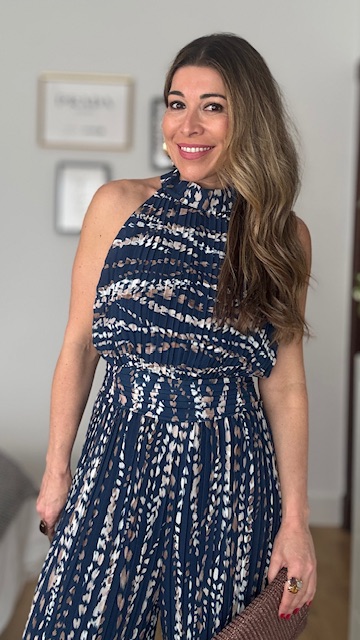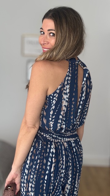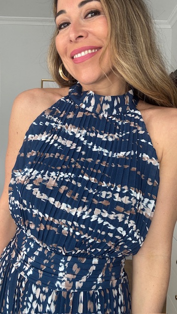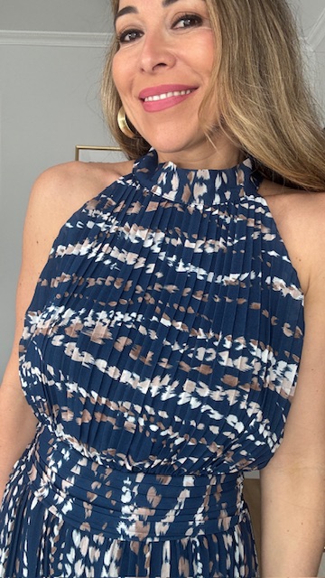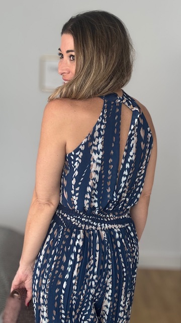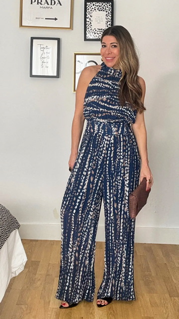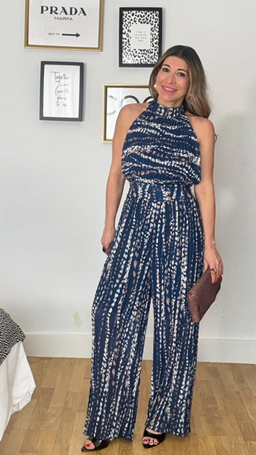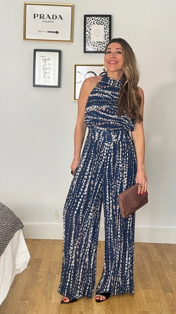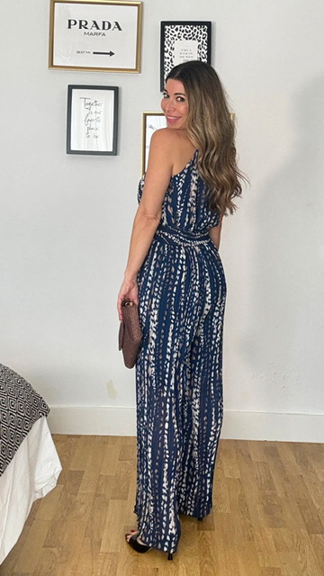Mono plisado con cuello tipo halter y pata ancha con estampado en color azul marino. Talla única válida desde la 36 hasta la 44.