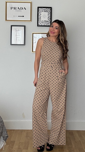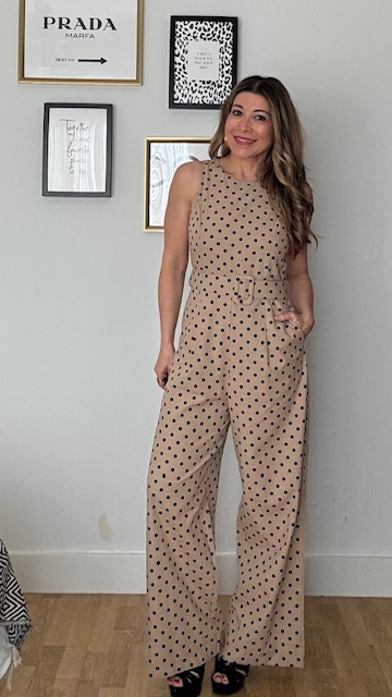 Mono con mangas a la sisa en color camel con estampado de lunares en color negro y cinturón. Disponible por tallas.