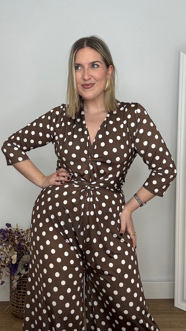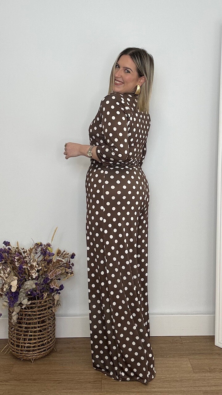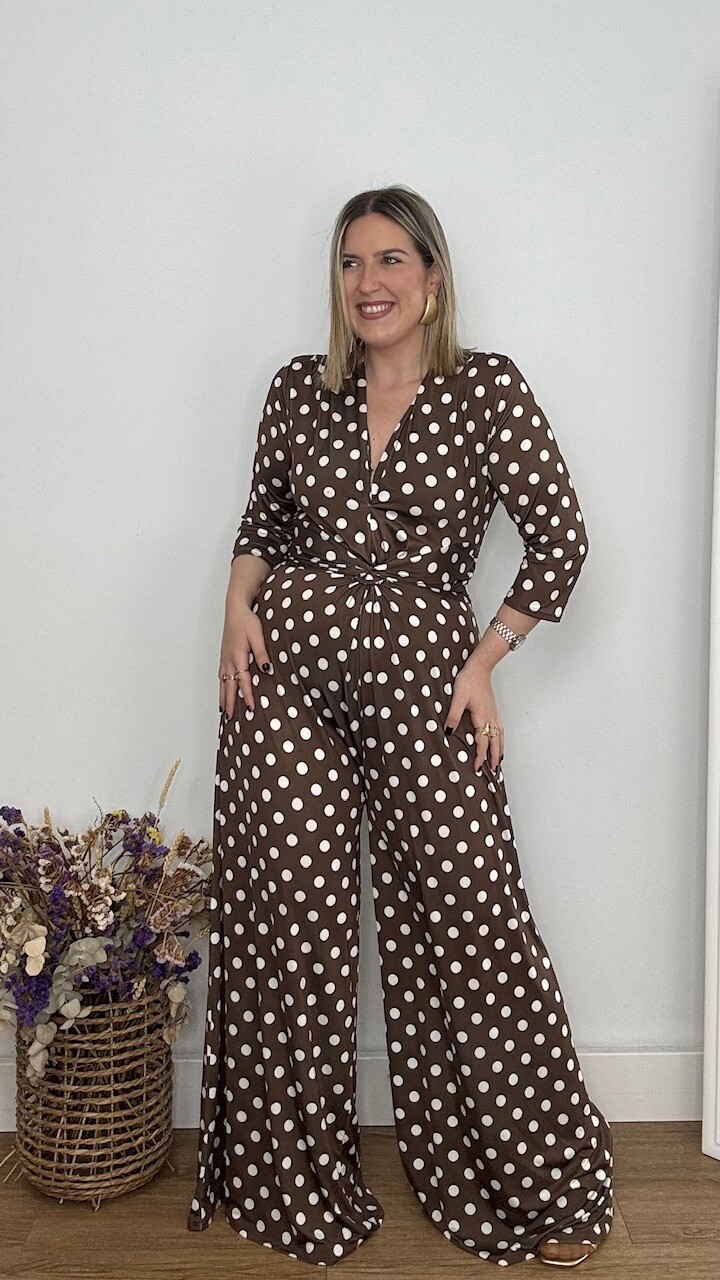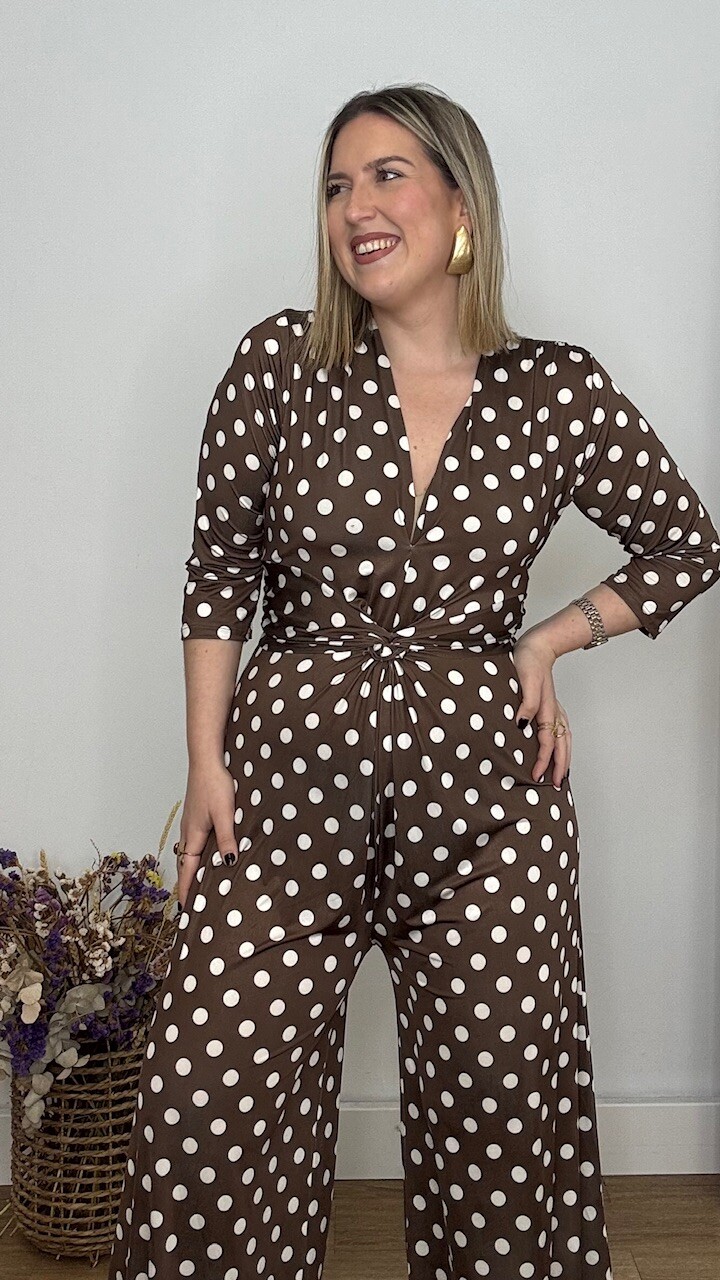 Mono con mangas de licra elástica en color marrón con lunares en color blanco. Talla única desde la talla 38/40 hasta la talla 44/46.